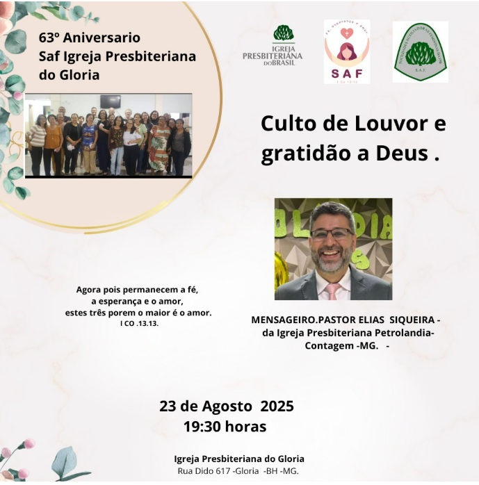 A Igreja Presbiteriana do Glória convida a todos para o culto de louvor e gratidão a Deus, pelo 63 anos da SAF local.